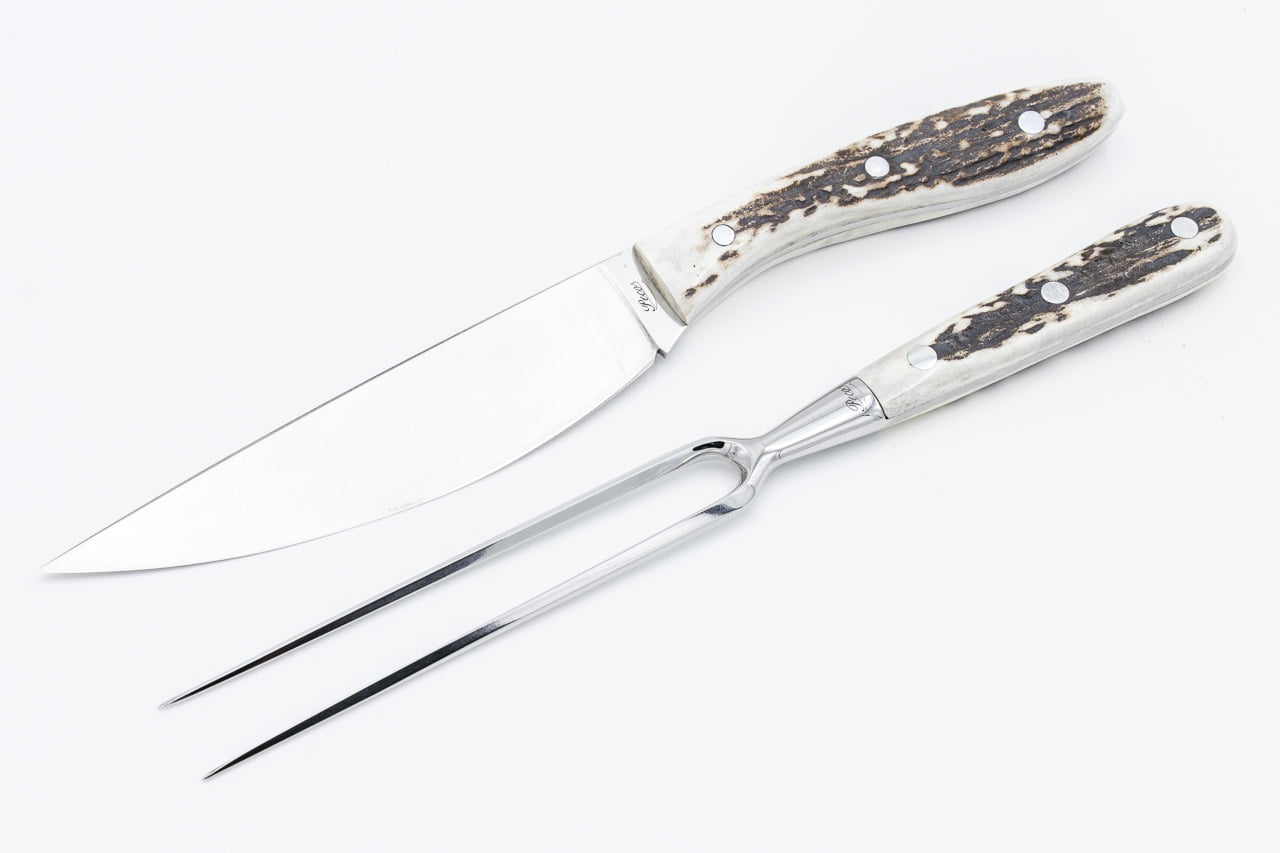 Set da servizio composto da coltello arrosto e forchettone artigianali. Entrambi i prodotti detengono la certificazione ROSH per uso alimentare.