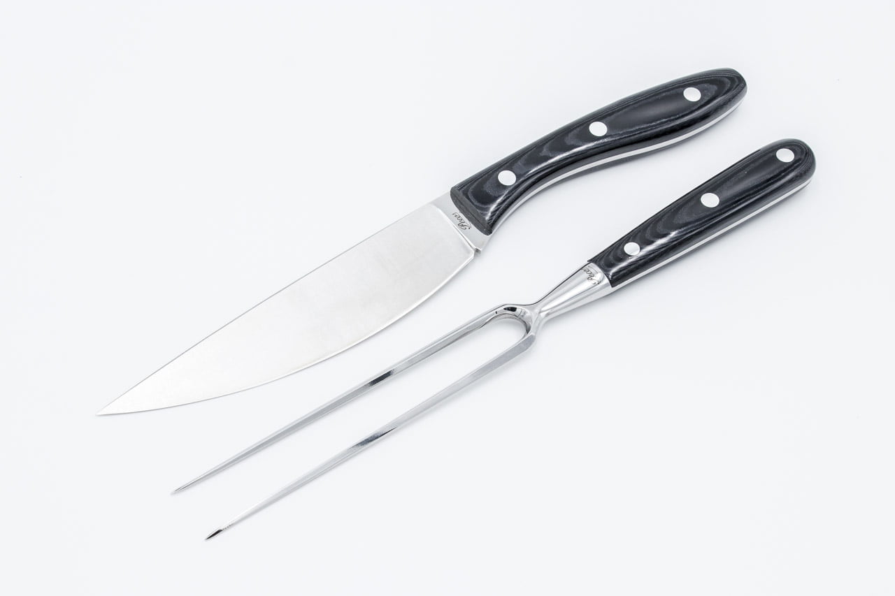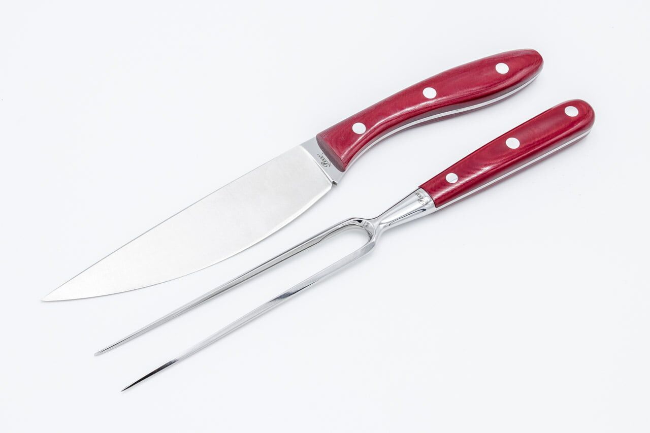 Set da servizio composto da coltello e forchettone artigianali. Entrambi i prodotti detengono la certificazione ROSH per uso alimentare.