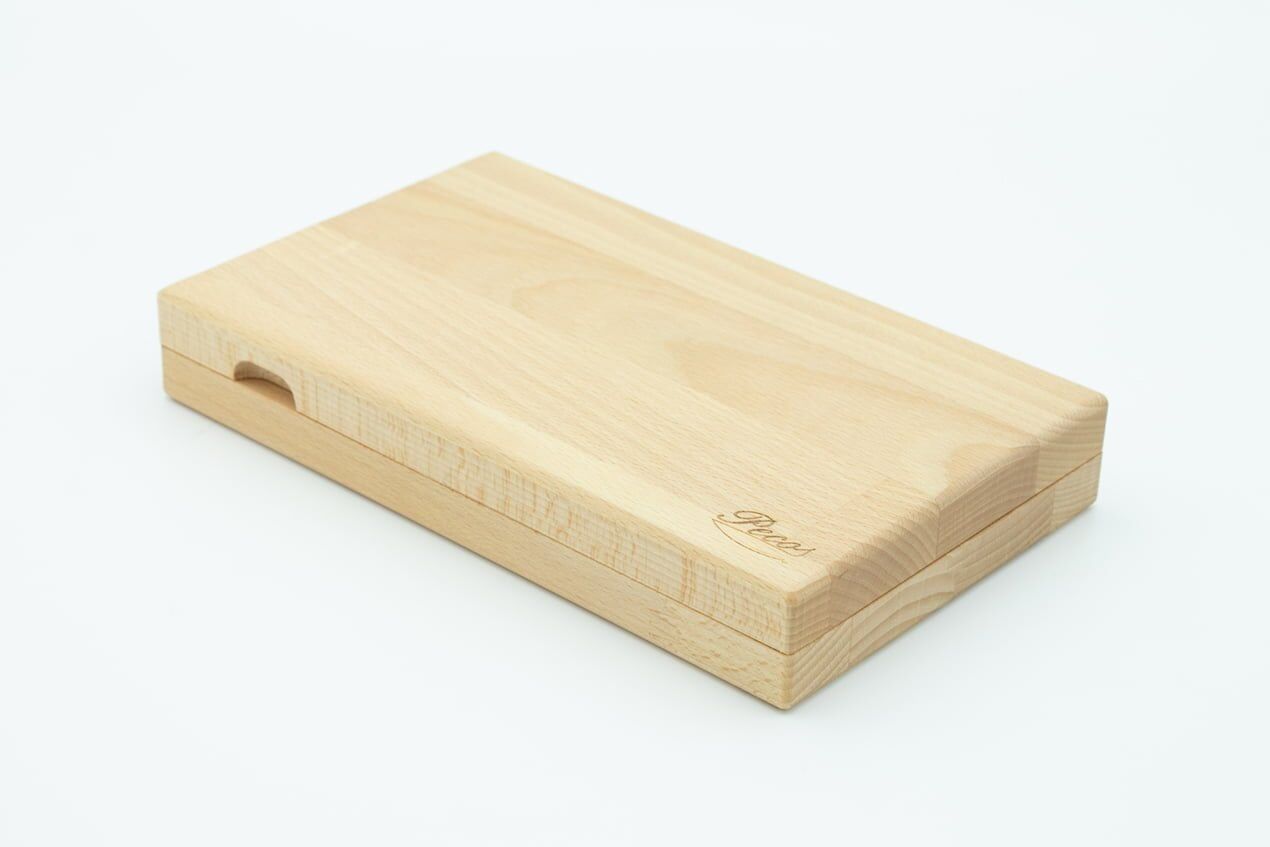 In legno di Faggio con chiusura magnetizzata e alloggio dedicato per apertura facilitata. Il design è studiato appositamente per enfatizzarne usabilità ed eleganza. Trattamento con olio alimentare specifico e certificazione ROSH.