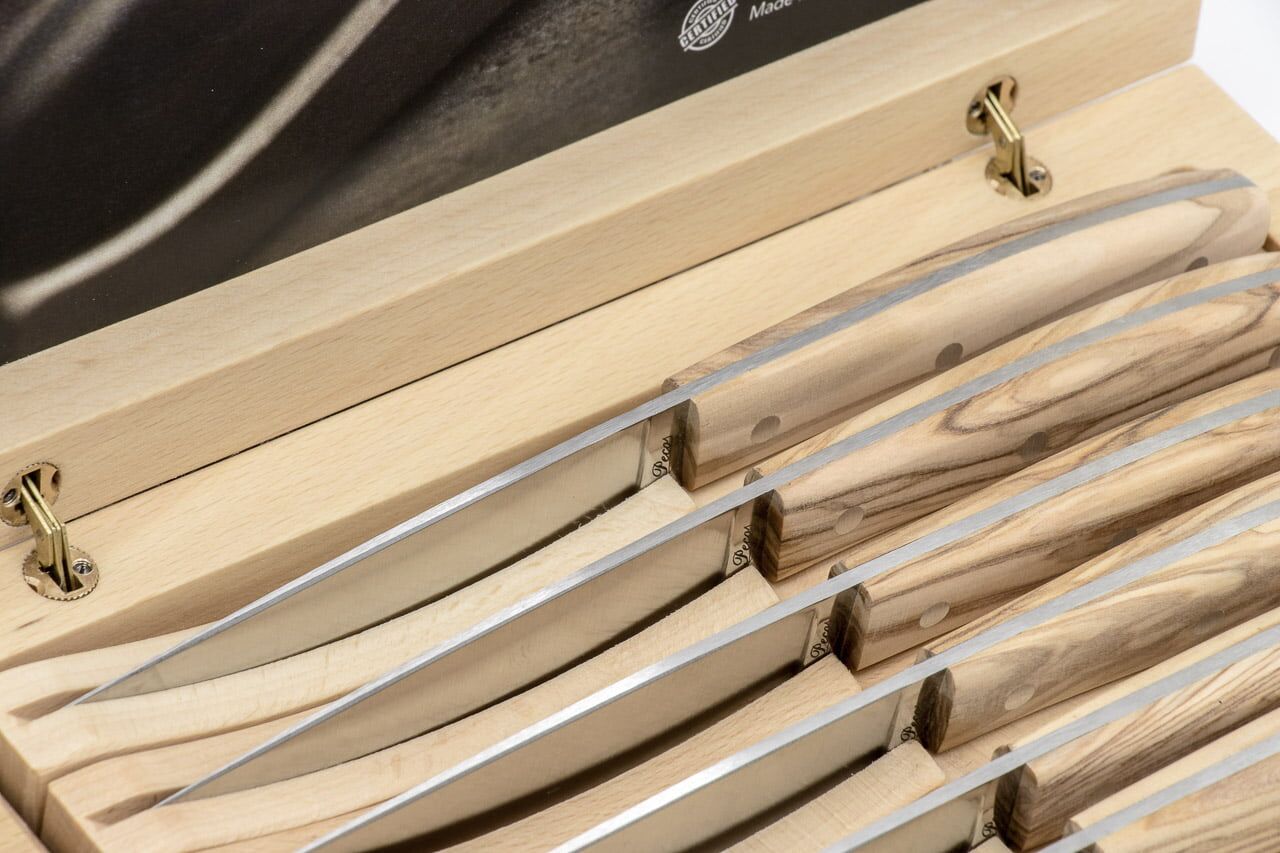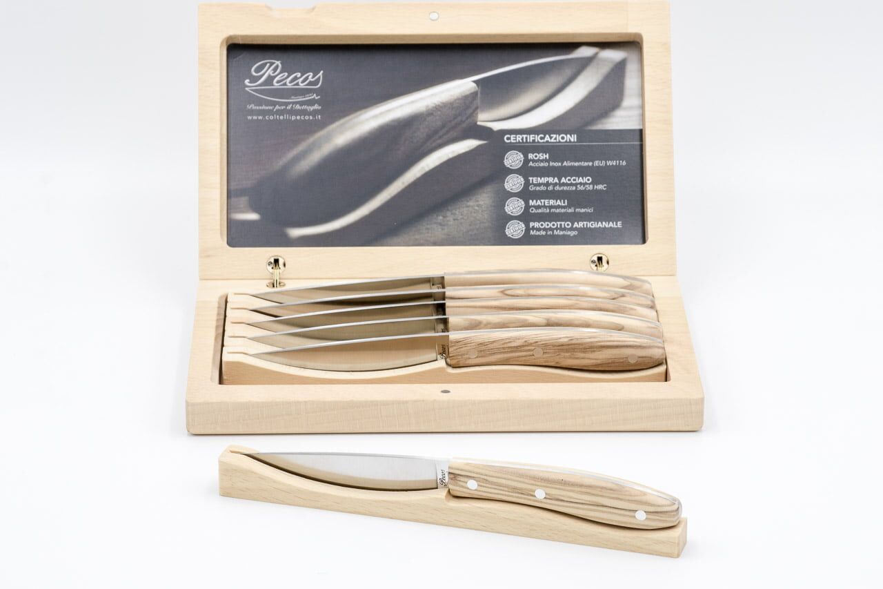 Set di 6 coltelli da bistecca con confezione in legno e supporti dedicati.
