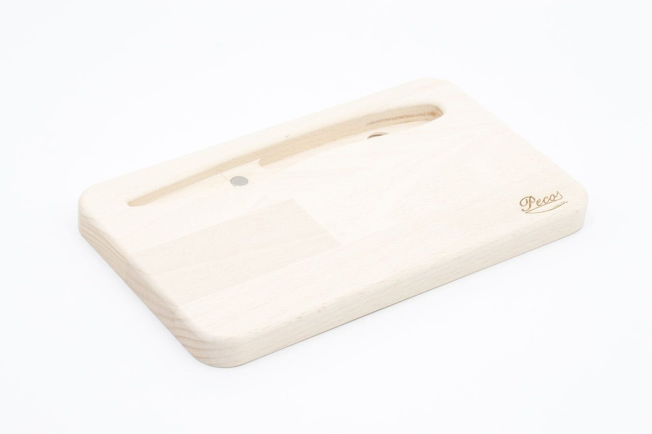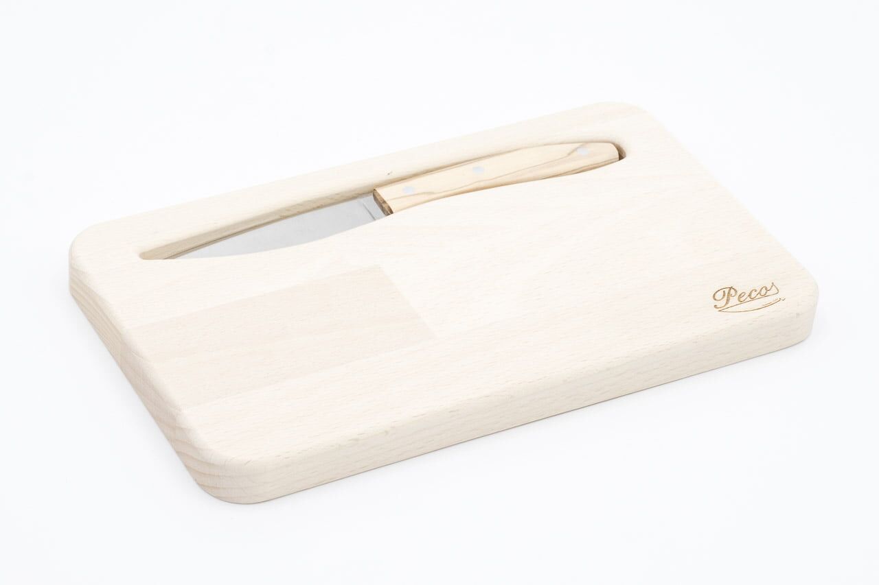 Un Kit composto da tagliere in legno di Faggio con inserto magnetico e coltello dedicato. Manico del coltello in legno lavorato completamente a mano. Lama in acciaio Inox W4116 (EU) temprato ad una durezza di 56/57 HRC, senza denti per un taglio preciso e pulito. Il prodotto detiene la certificazione ROSH per uso alimentare.
