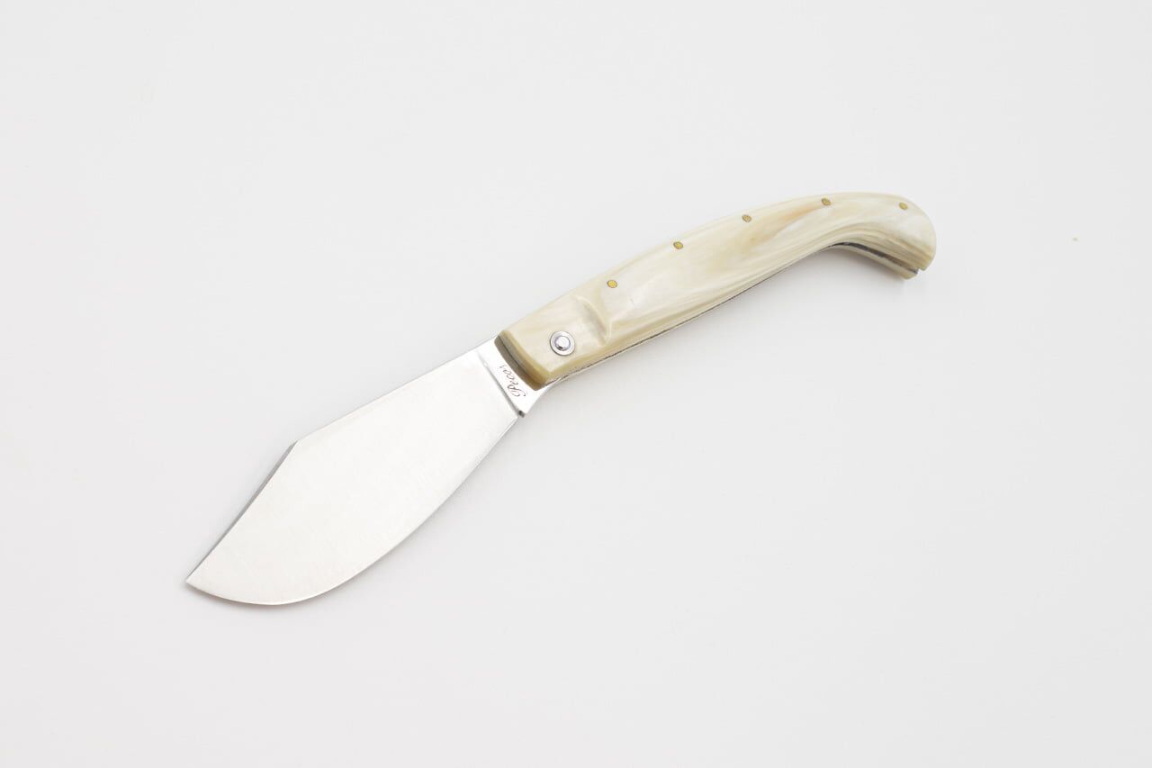 Coltello da scuoio con manico animato in corno bovino biondo e lama in acciaio Inox W4116 W4116 (durezza 56-57 HRC) da 10 cm.